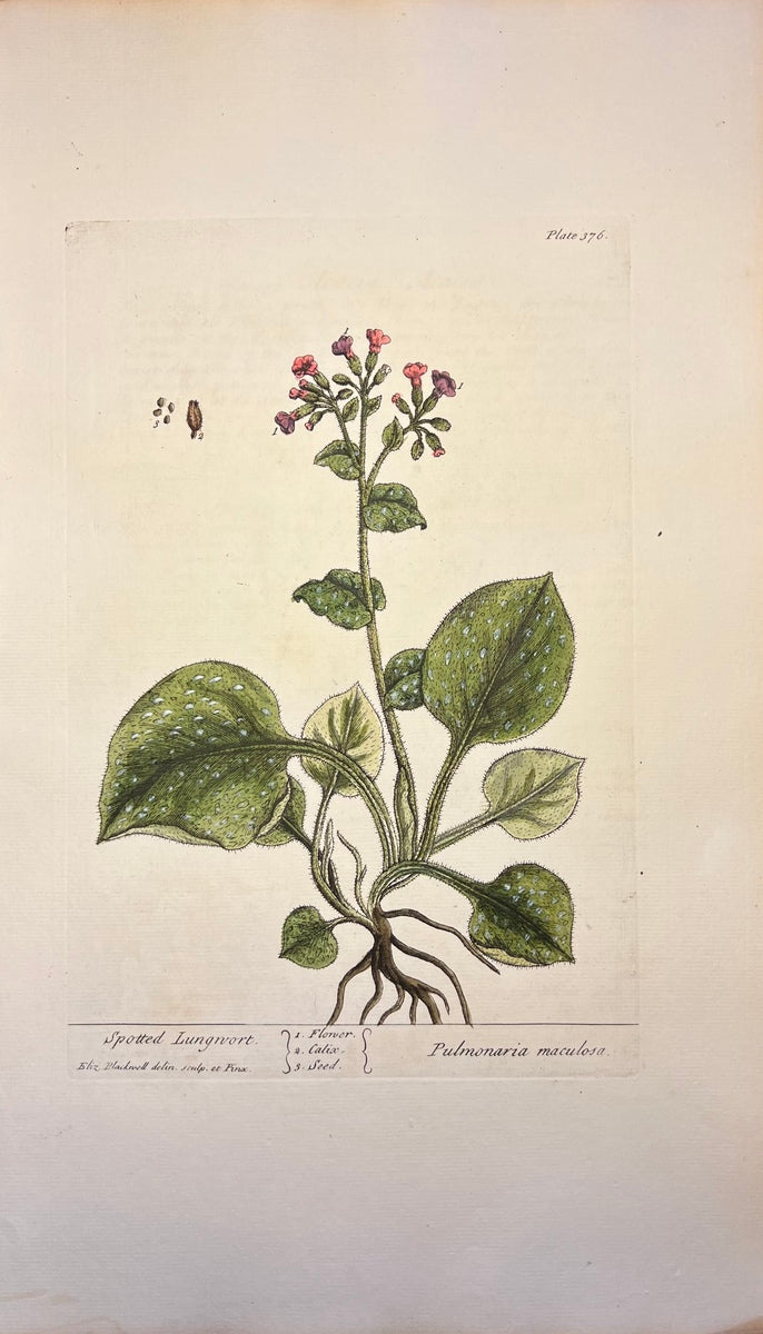 Spotted Lungwort, Plate #376, From Elizabeth Blackwell's 'A Curious Herbal'. This is a hand-colored engraving on watermarked "I TAYLOR" paper. Circa 1770-1790.