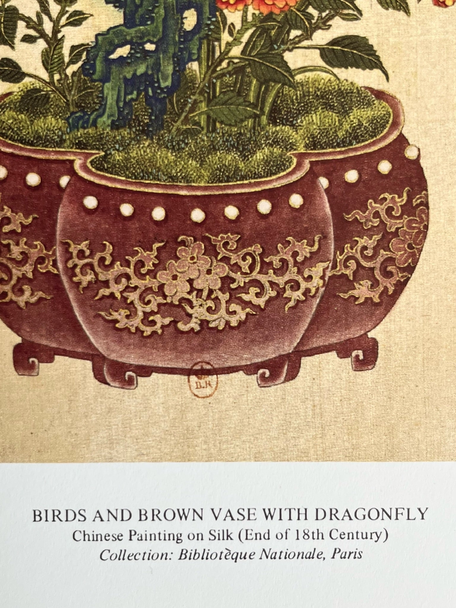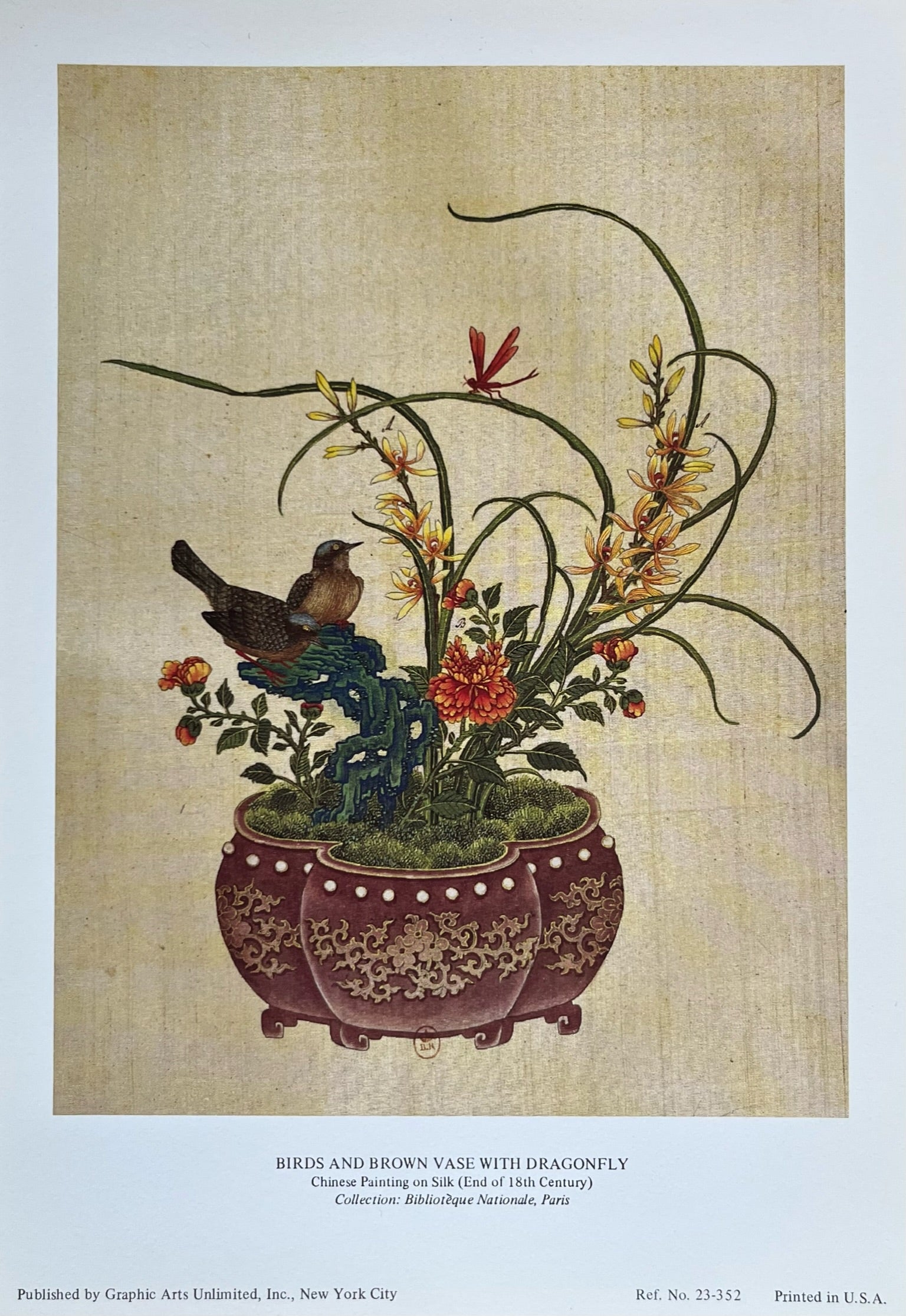 "Birds and Brown Vase with Dragonfly" is a 7" x10" art print, unframed. The original artwork was a Chinese painting on silk (c. the end of 18th century) and the artist was from a Chinese School and further information is unknown. The original painting is in the Bibliotheque National in Paris, France. This print was published by Graphic Arts Unlimited, inc. Printed in the U.S.A.