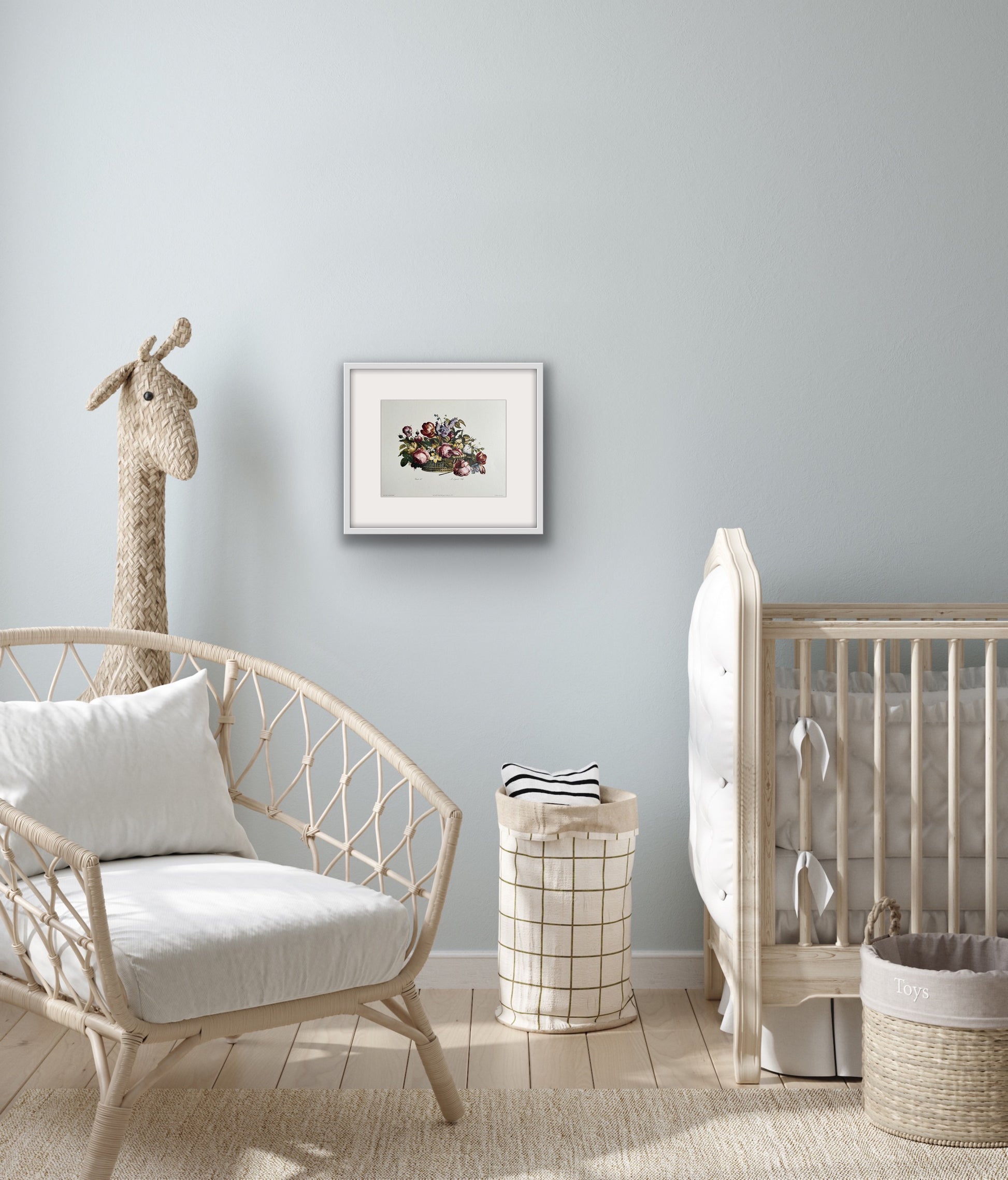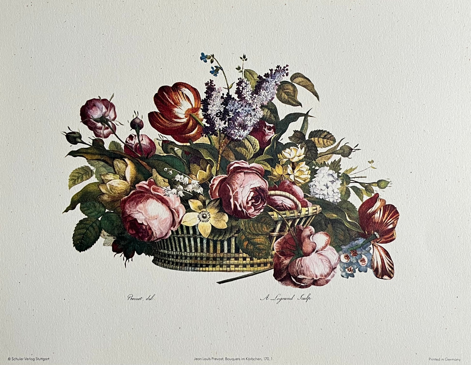 Bouquets im Korbchen, 170, 1 was originally painted by Jean-Louis Prevost and printed by Schuler Verlog Stuttgart (19th century). Jean-Louis Prevost was known for painting landscapes and flowers mostly in watercolor. a This print is 11 1/4 x 8 5/8 on laid paper, unframed. Printed in Germany.