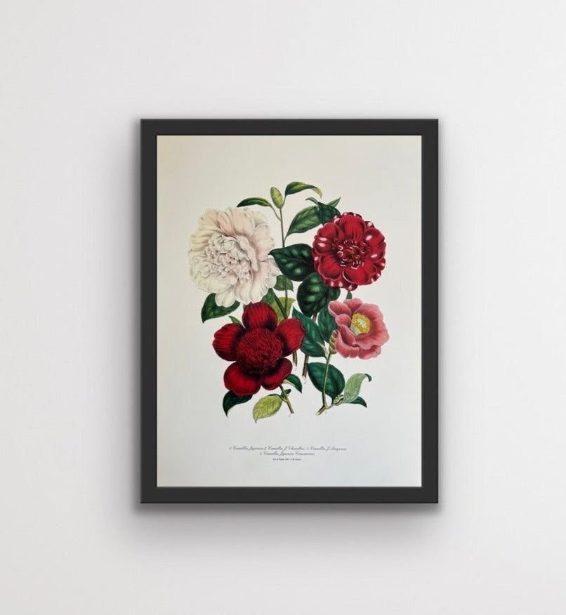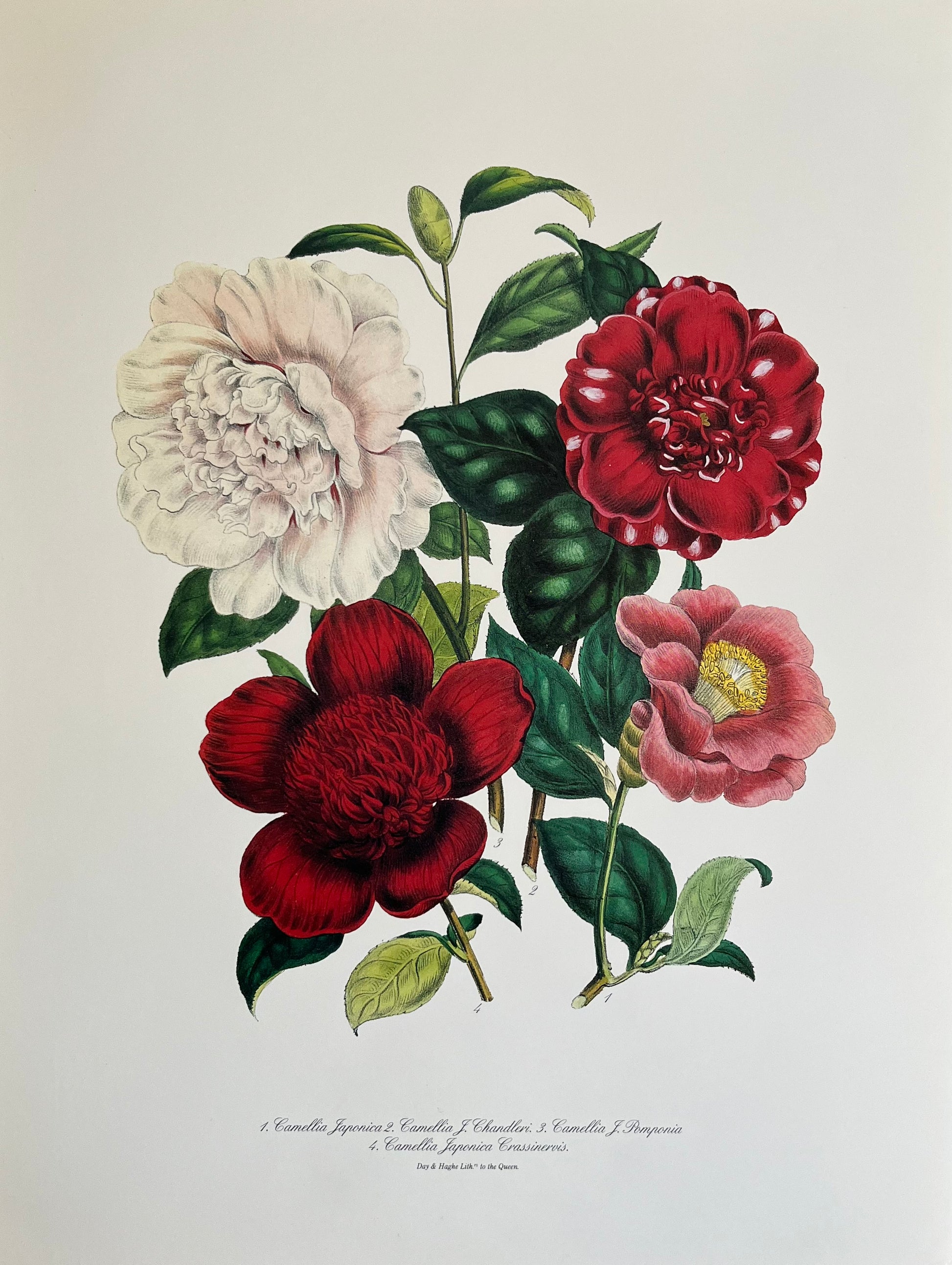 "Camellia's" is a print depicting an illustration published by Jane Webb Loudon in the 19th century. "Day & Haghe Lith" to the Queen is printed at the bottom. Day & Haghe was a British Lithograph firm. This print is 9.5 x 12.5 with a smooth finish. Unframed.