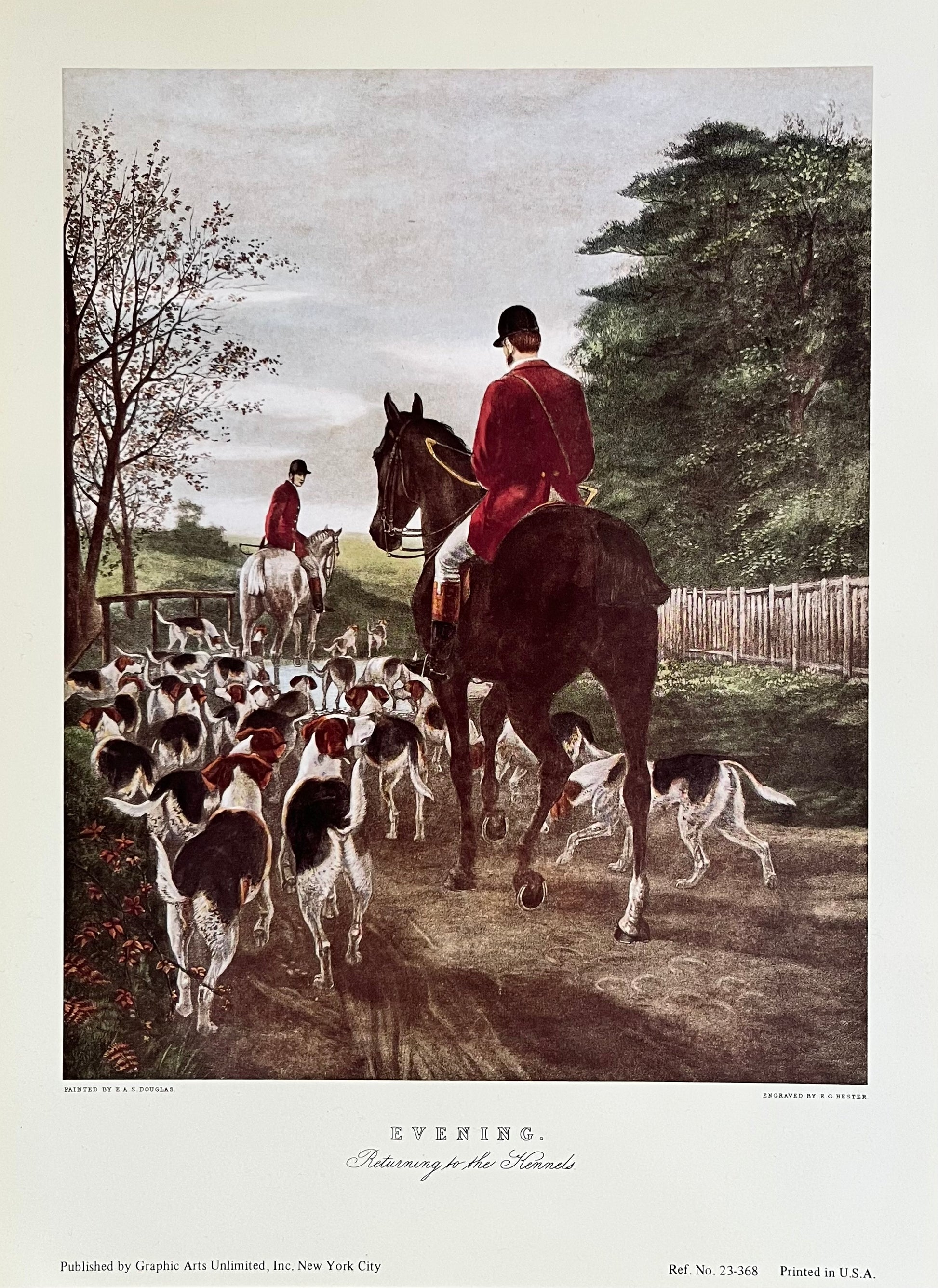 "Evening Returning to the Kennels" was originally painted by E.A S. Douglas (c. 1880) and engraved by E. G. Hester. Douglas was a London based artist known for his focus on hunting scenes. This print is 9 5/8 x 13 with a smooth finish. Printed in the USA.