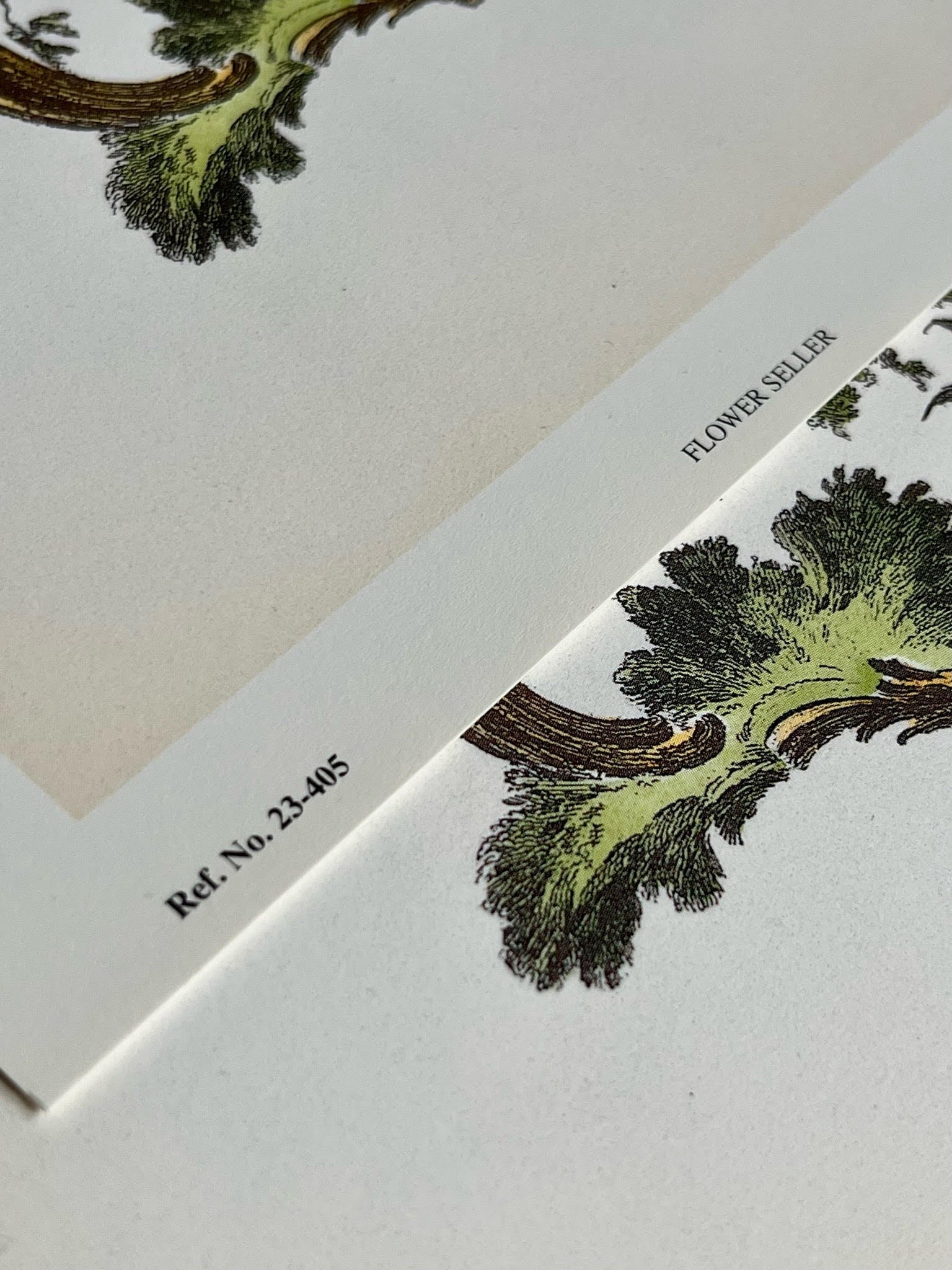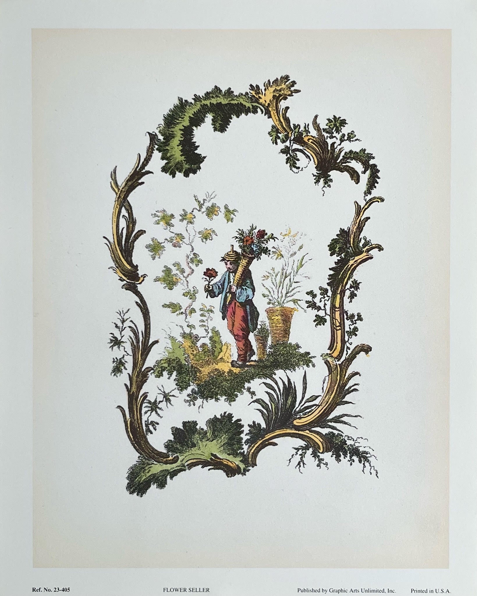 "Flower Seller" is an 8 x 10 print. The artist is unknown. This vibrant, whimsical print was published by Graphic Arts Unlimited, Inc. Printed in U.S.A.