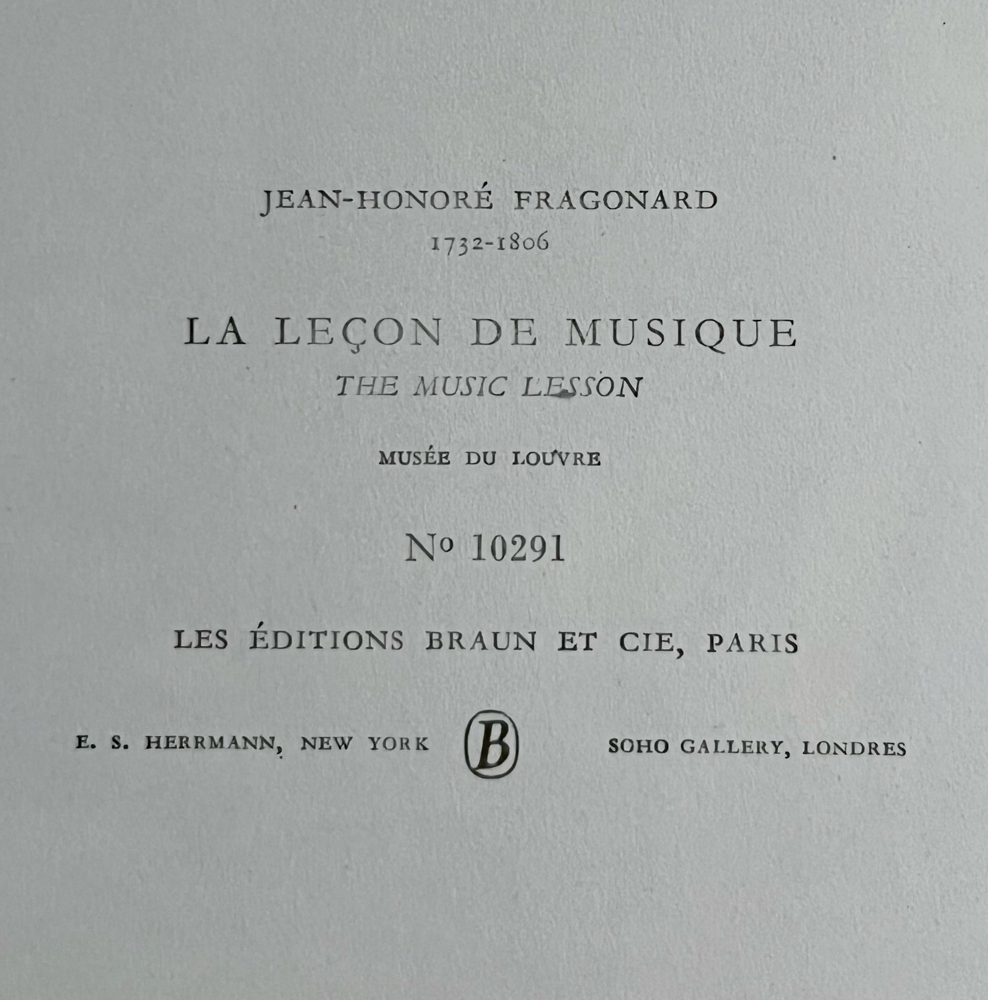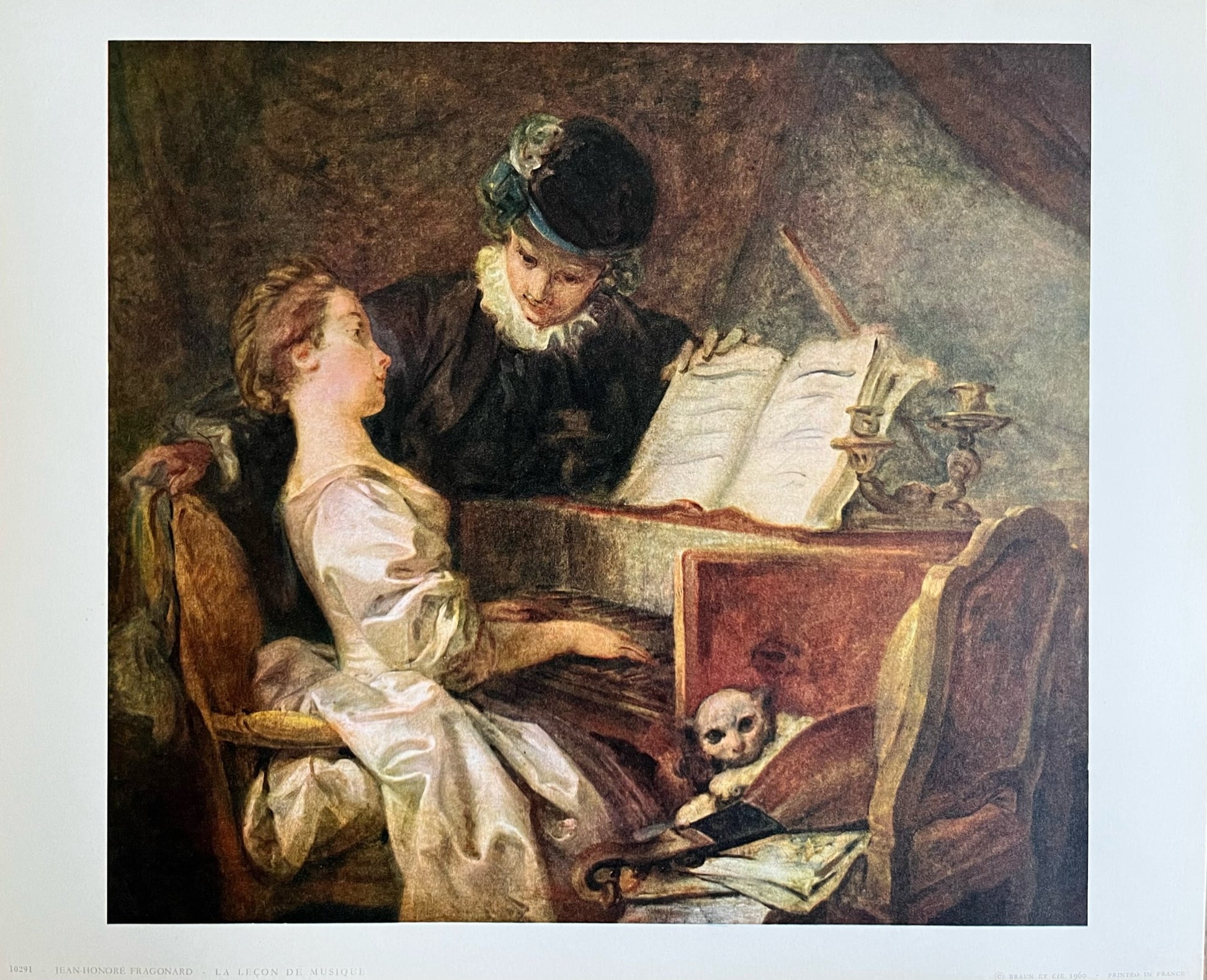 "La Lecon de Musique" also known as "The Music Lesson" was originally painted in 1769 by Jean-Honore Fragonard (1732-1806). Fragonard was a French painter, drawer, and etcher. The original painting is in the Louvre Museum, Paris. This print is 11 1/2 x 9 1/2 , unframed. Printed in France and published by Braun Et Cie (1960).