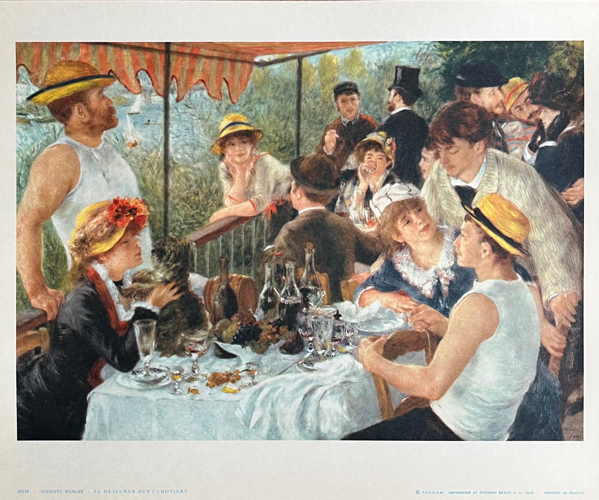 "Les Dejeuner des Canotiers" also known as Luncheon of the Boating Party (1881), was originally painted by Auguste Renoir (1841-1919) using oil paints on canvas. This print is 11 1/2 x 9 1/2. Printed in France (1956). This painting depicts a crowd at a favorite restaurant of Monet and Renoir, the Auberge du Pere Furnace. The image served as a reminder of the importance of the social circle to accomplish things and included a variety of professionals from various industries. The original painting now resides in The Phillips Collection in Washington, D.C. and was acquired in 1923. Printed by Braun S. A. Mulhouse-Paris.