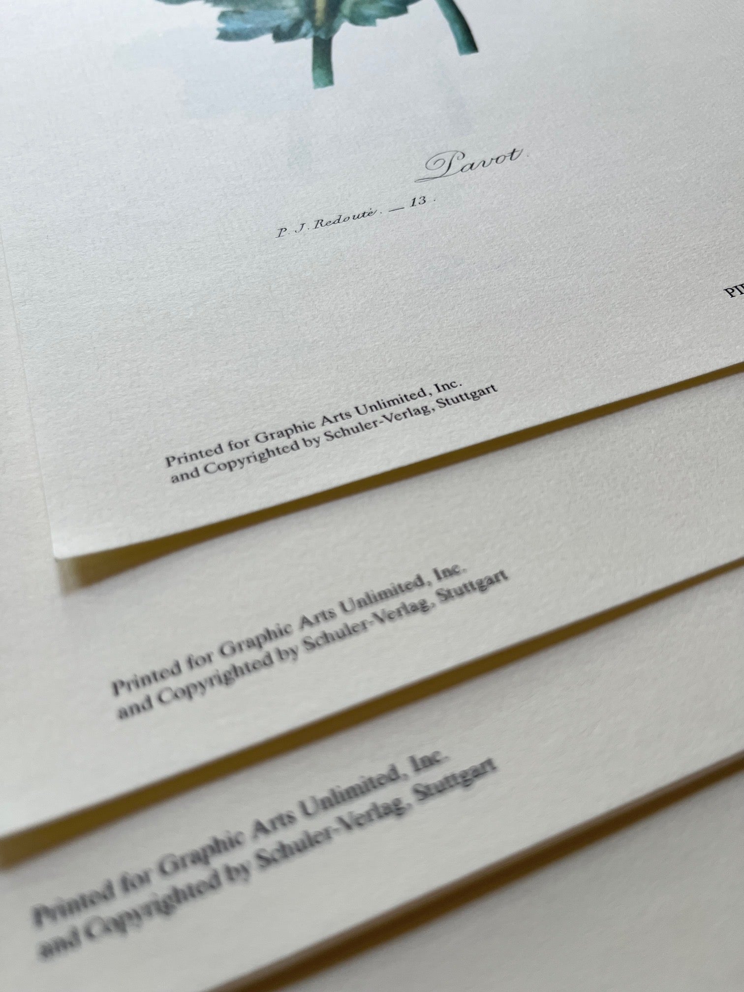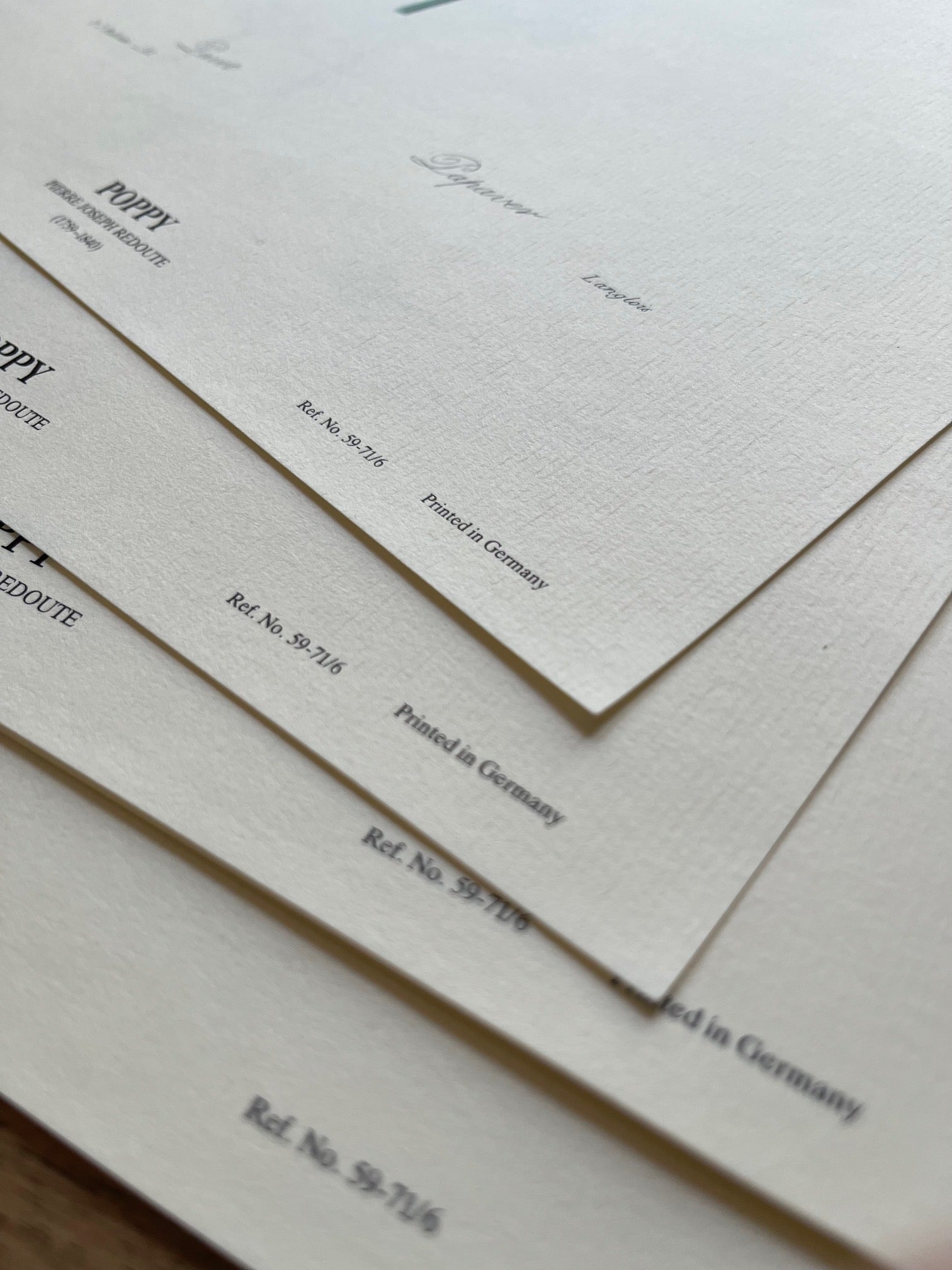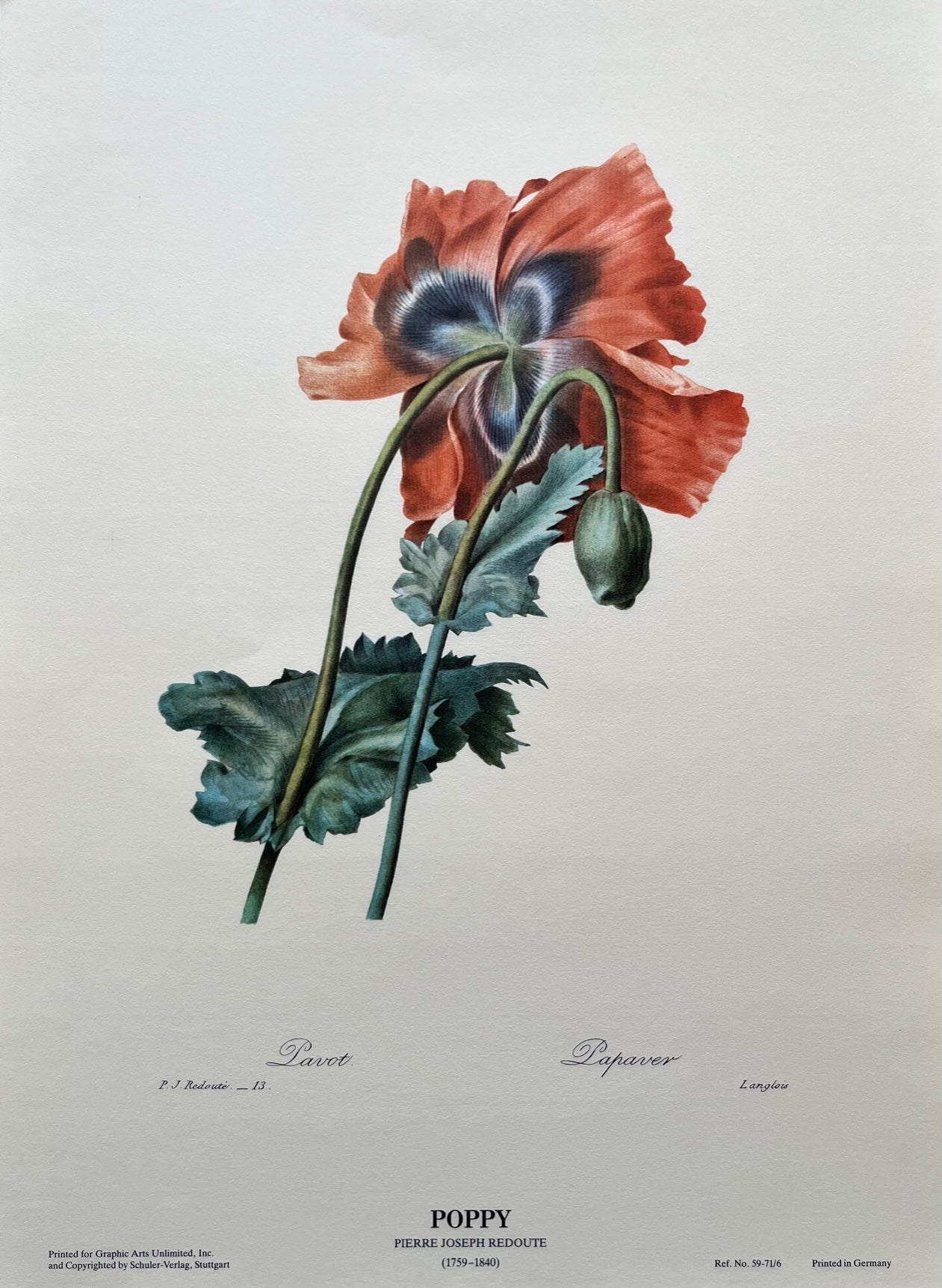 "Poppy" was originally painted by Pierre Joseph Redoute (1759-1840). Redoute was a painter with a background in botany from the Netherlands. This print is 11 1/2 x 16 on laid paper. Printed in Germany.