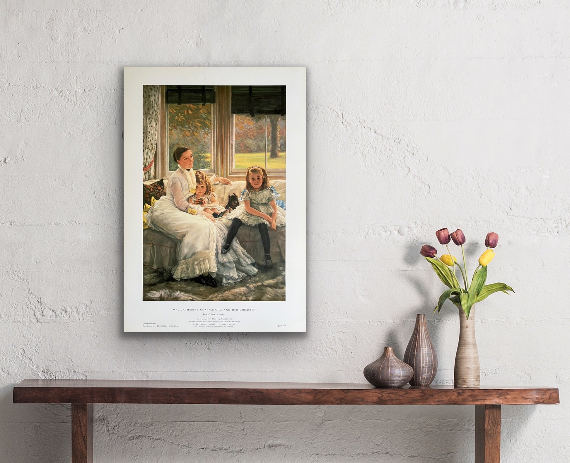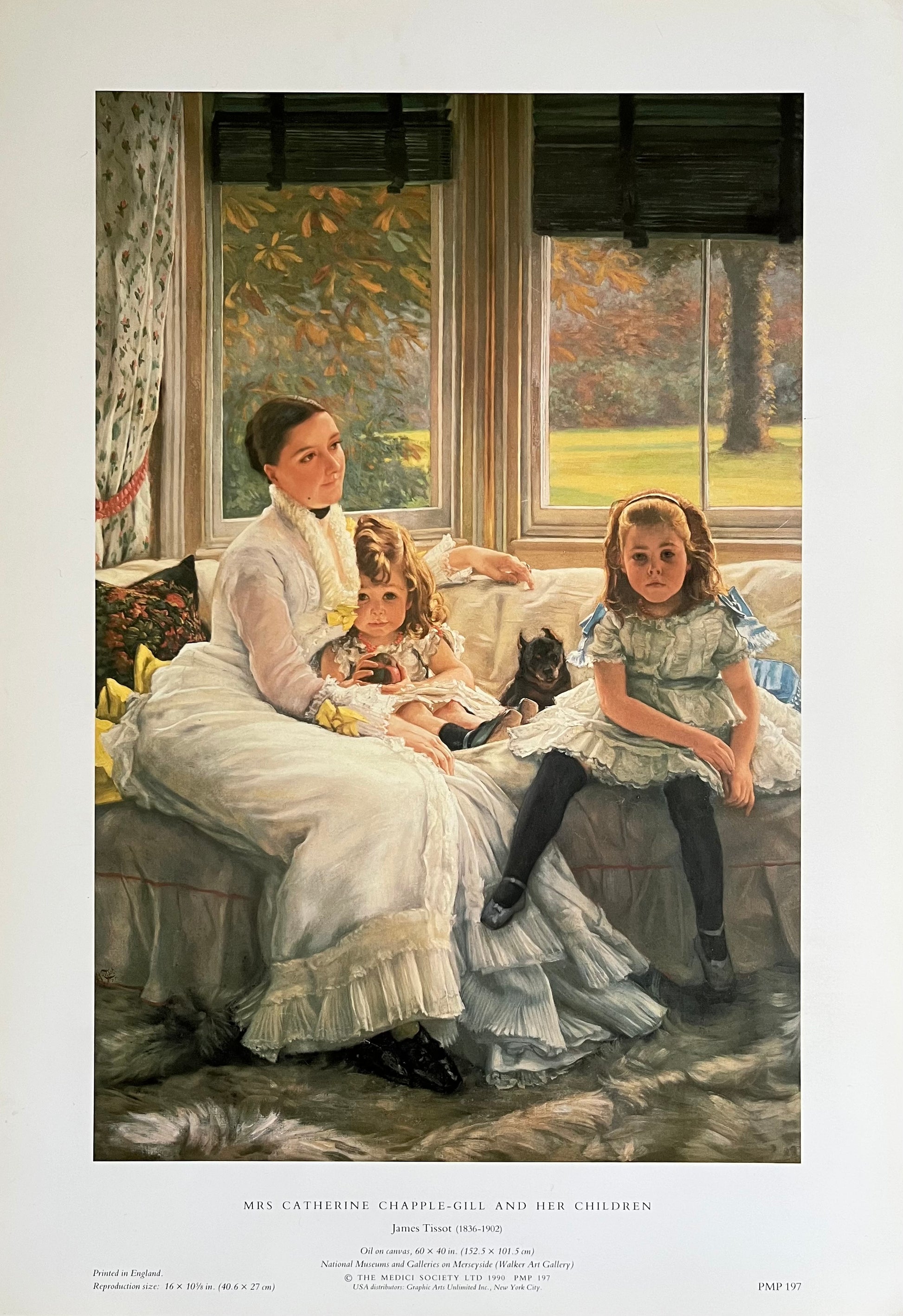 The Portrait of Catherine Smith Gill and Two of Her Children is a 13 3/4 x 20 print with a glossy finish. The original artwork was an oil on canvas painting created by James Tissot (c. 1877). These high quality prints were created in 1990. Tissot was a French painter and printmaker. With hints of impressionism in his work, he later declined an invitation by the artist Degas in 1874 to participate in an exhibition with other impressionists.