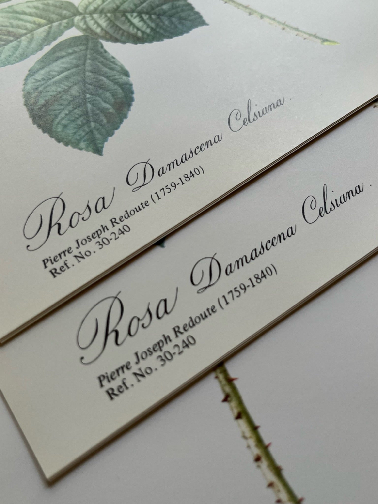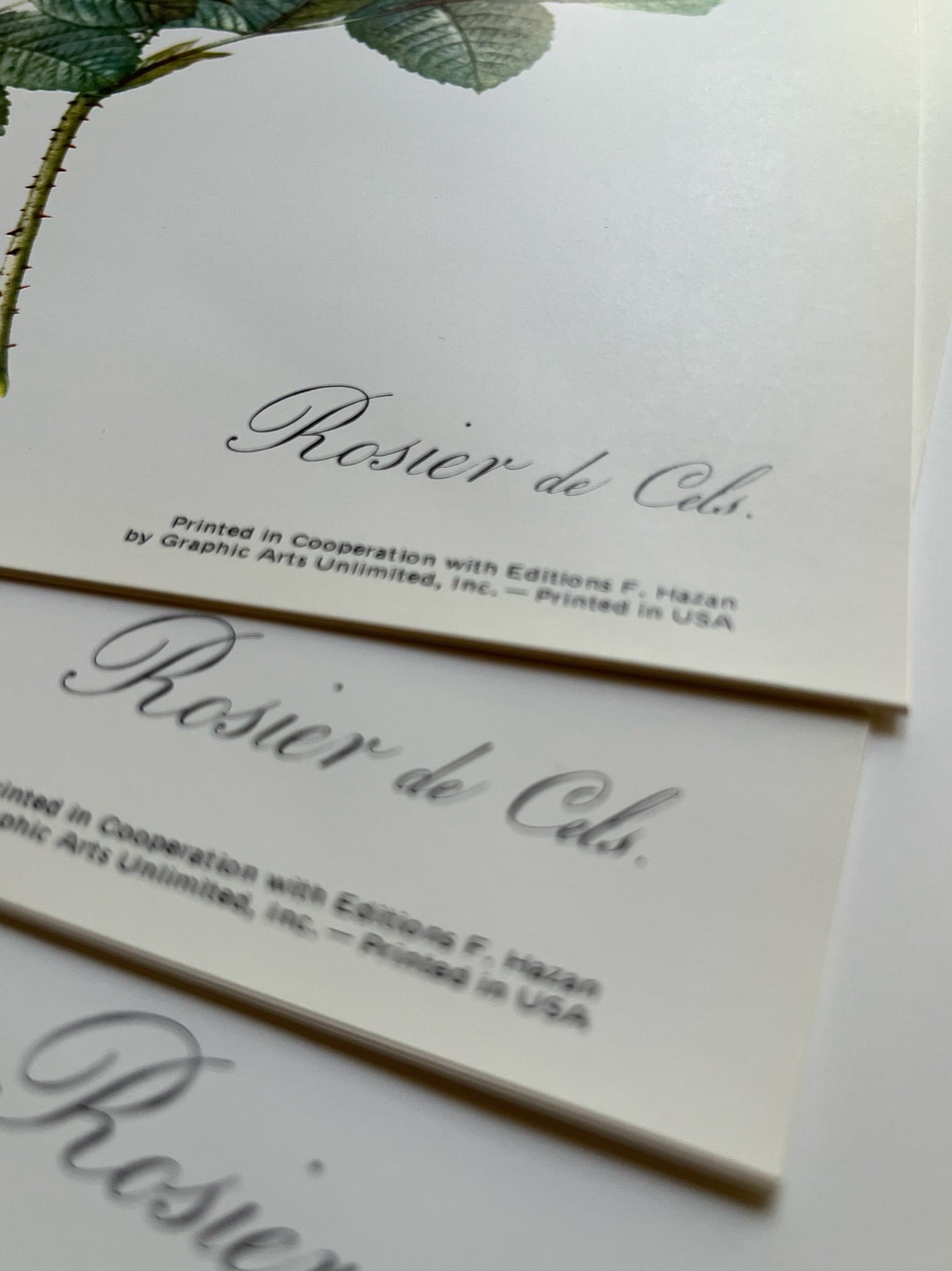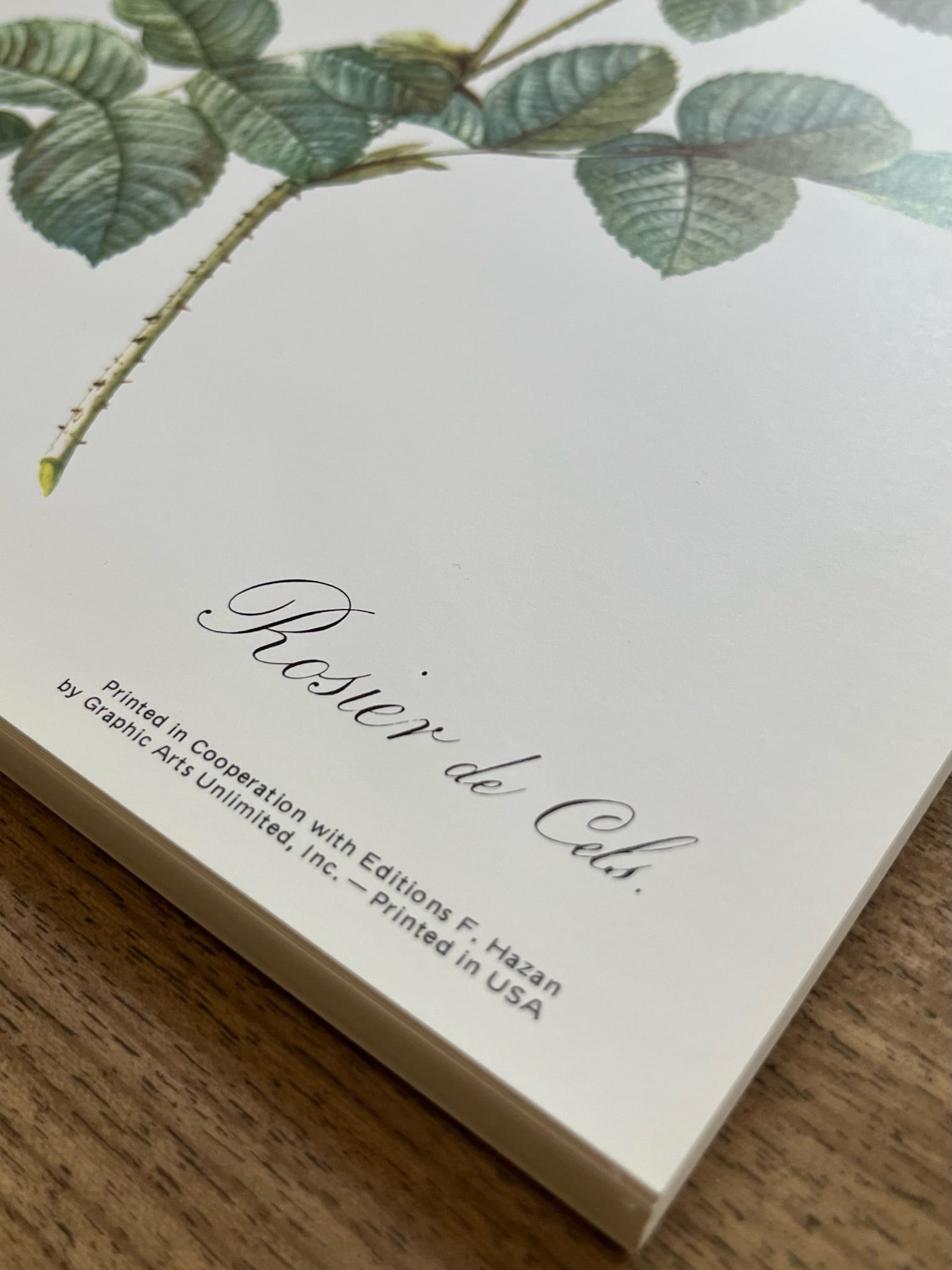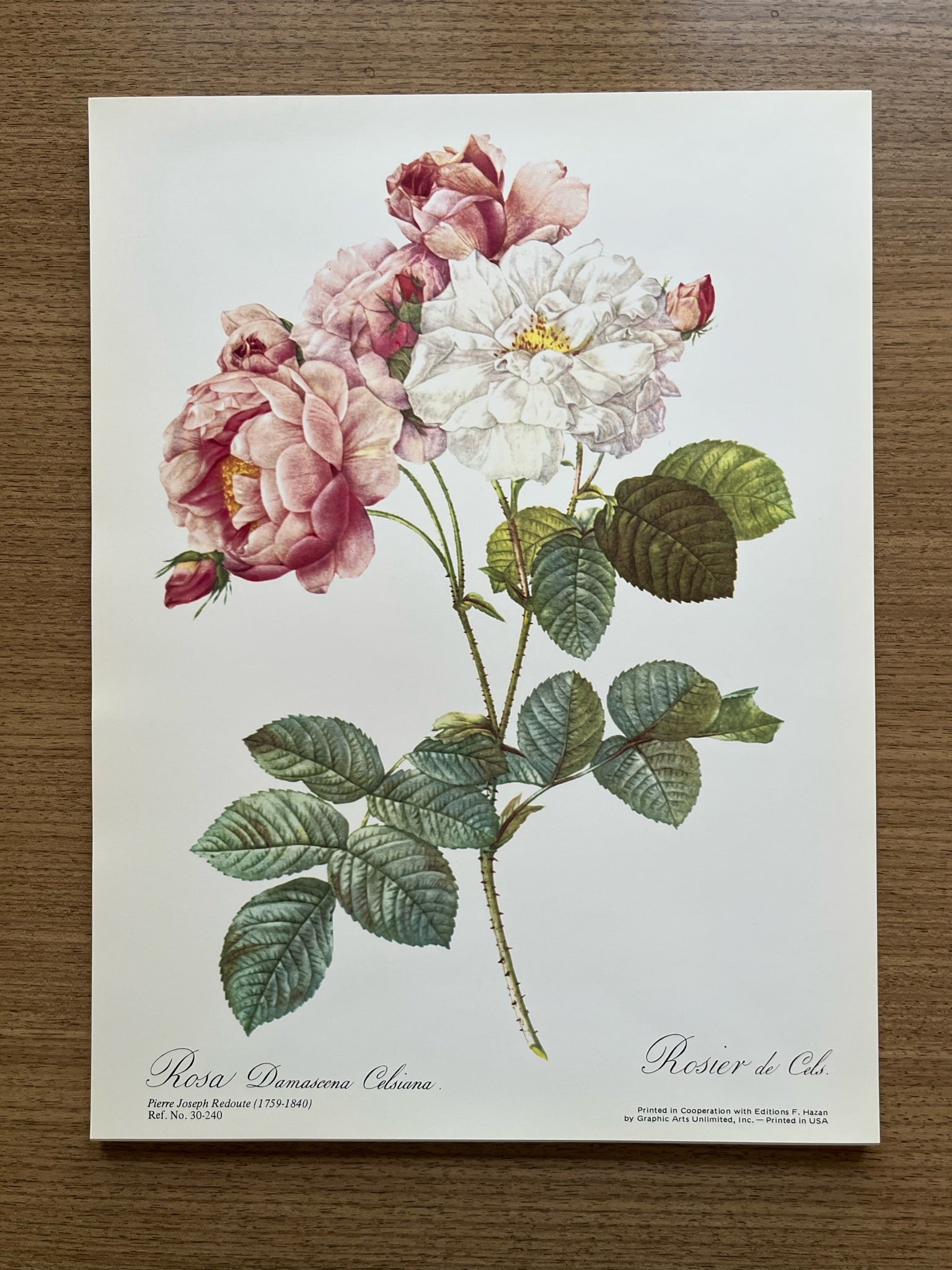 "Rosa Damascena Celsiana" was originally painted by Pierre Joseph Redoute (1759-1840). Redoute was a painter with a background in botany from the Netherlands. This print is 9.5" x 12.75" with a slight glossy finish. Printed in the USA. In excellent condition.