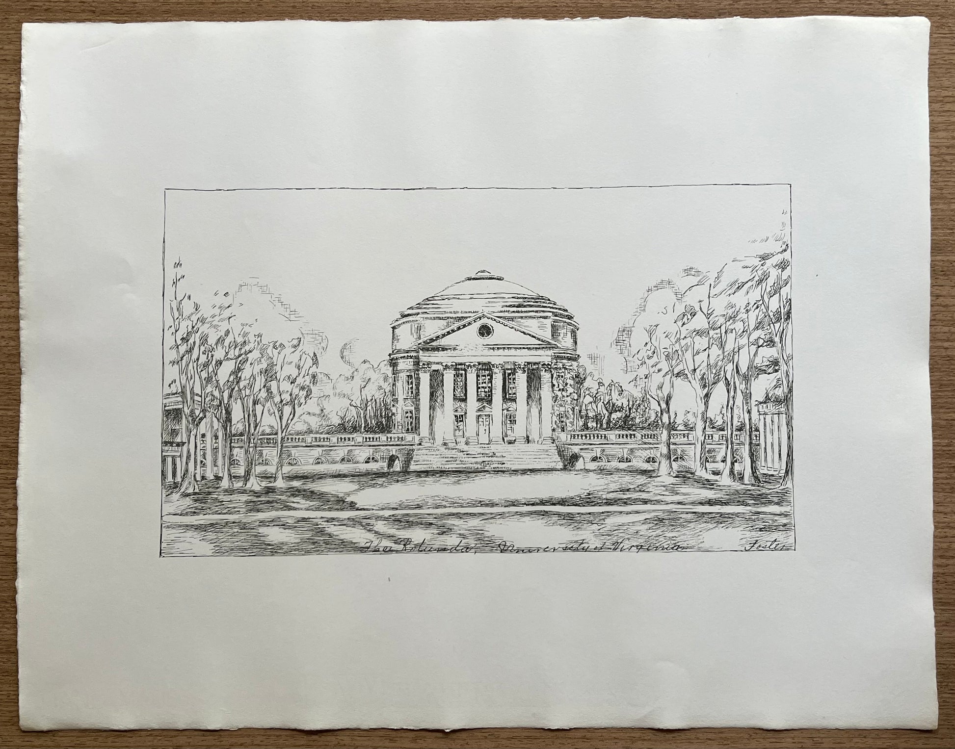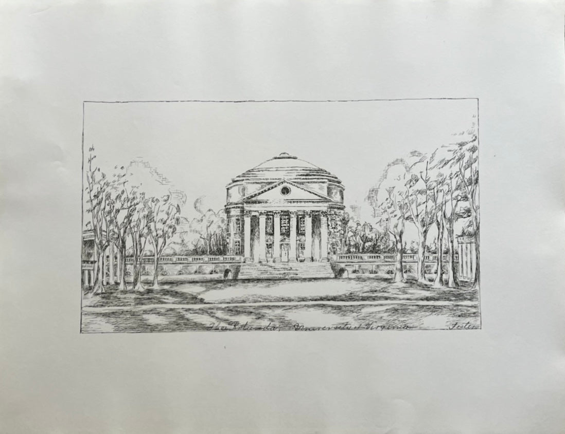 "The Rotunda" art print depicts a pen and ink style depiction of the University of Virginia on J. Whatman paper dated 1932 (When held up to the light you can see the watermark). This print is signed "Foster" in the bottom right hand corner. James Whatman invented woven paper. Prior to Whatman's paper, all paper was "laid" with lines running through it. J. Whatman paper was the first of its kind with a smooth surface for artists to create on and prints to be published on making this print a piece of history.