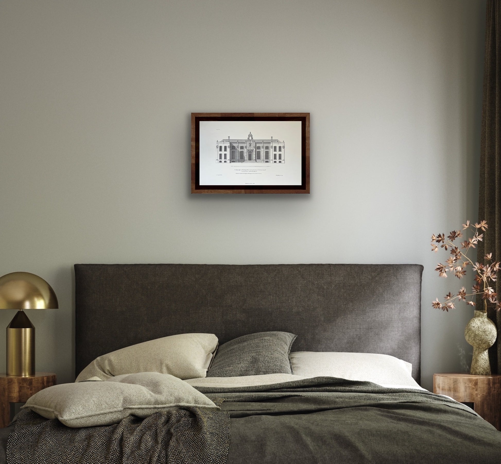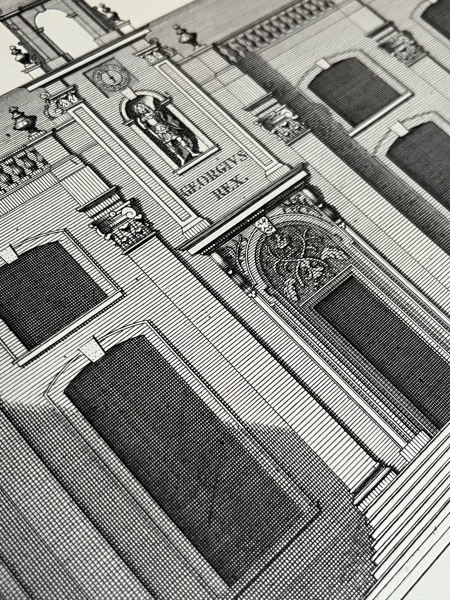 "The West Prospect of Beddington Place in Surrey from Vitruvius Britannicus" is a 22" x 14" art print with a matte finish. The original artwork was created by Colen Campbell (1676-1729) and engraved by Henry Hulsbergh. Campbell was a Scottish architect known for founding the Georgian style. This 1987 print was published by Ridgefield, Inc.