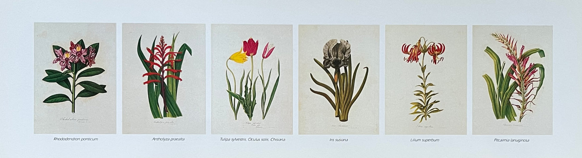 This vintage botanical small art print features 6 floral depictions. The artist is unknown. The flowers depicted are: Rhododendron ponticum, Antholyza praealta, Tulipa sylvestris, Oculus, Chisana, Iris susiana, Lilium superbum, and Pitcairnia languginosa. This print is 4 1/2 x 16 with a glossy finish, unframed.