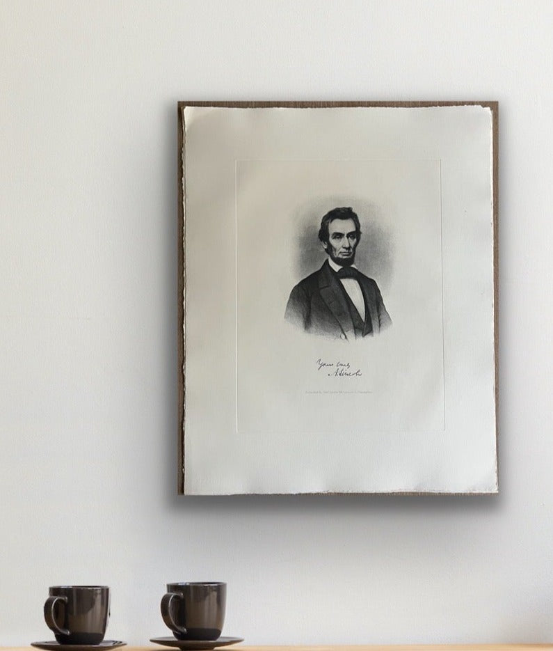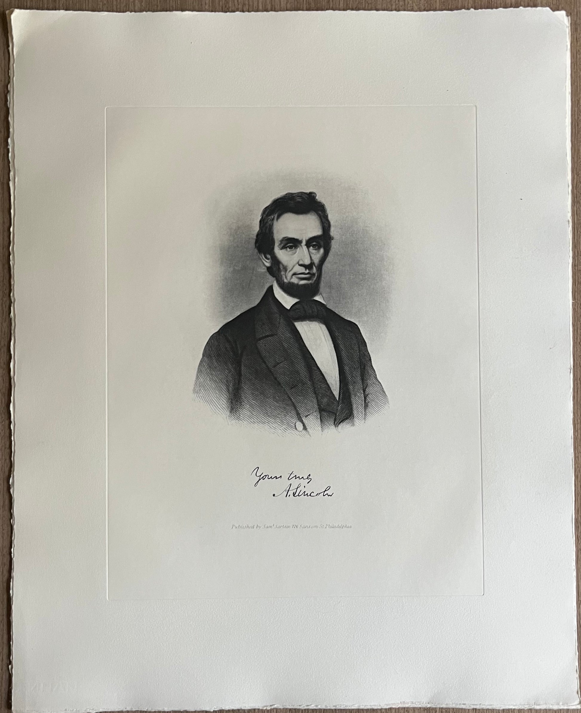 "Yours truly A. Lincoln" engraving with plate mark. This print is 24 1/2 x 19 5/8. The engraving was created by Samuel Sartain. Samuel Sartain was an engraver in Philadelphia who created Abraham's likeness (c. 1864) after an original portrait created by John Henry Brown. John Henry Brown based his artwork off of a photograph and then handed it off to Samuel Sartain to create an engraving to use the prints in a political campaign.